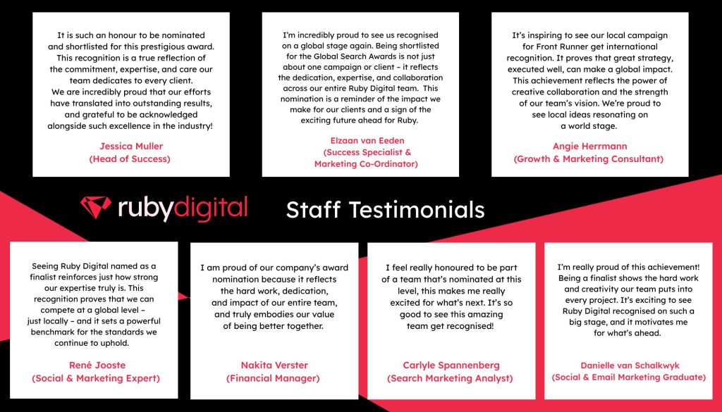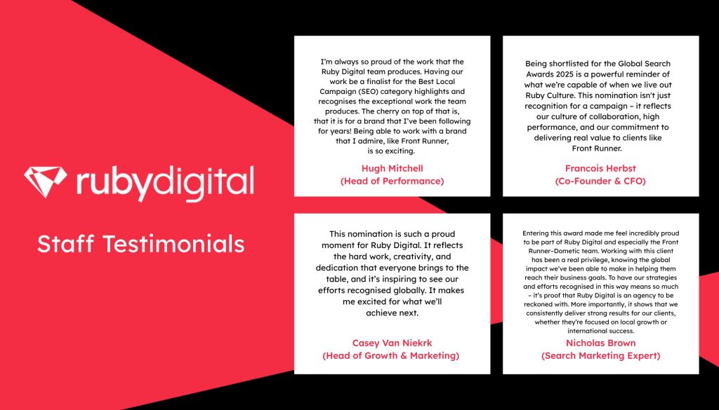 “Being nominated for the Global Search Awards is an incredible moment for our team. It validates not only our strategies but also the hard work, commitment, and creativity that everyone at Ruby Digital puts into helping our clients succeed.” – (Justin Lester, Founder & CEO)